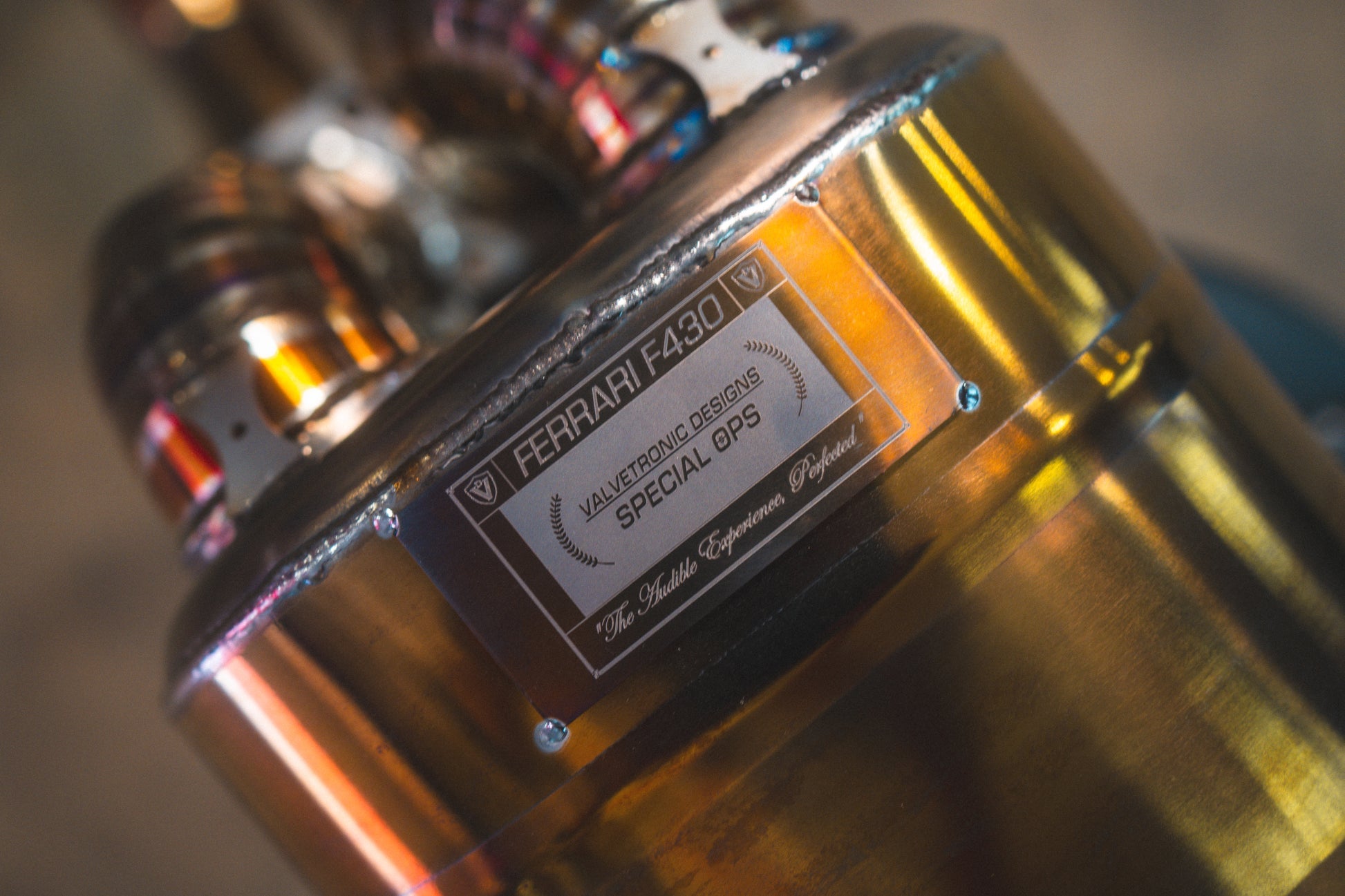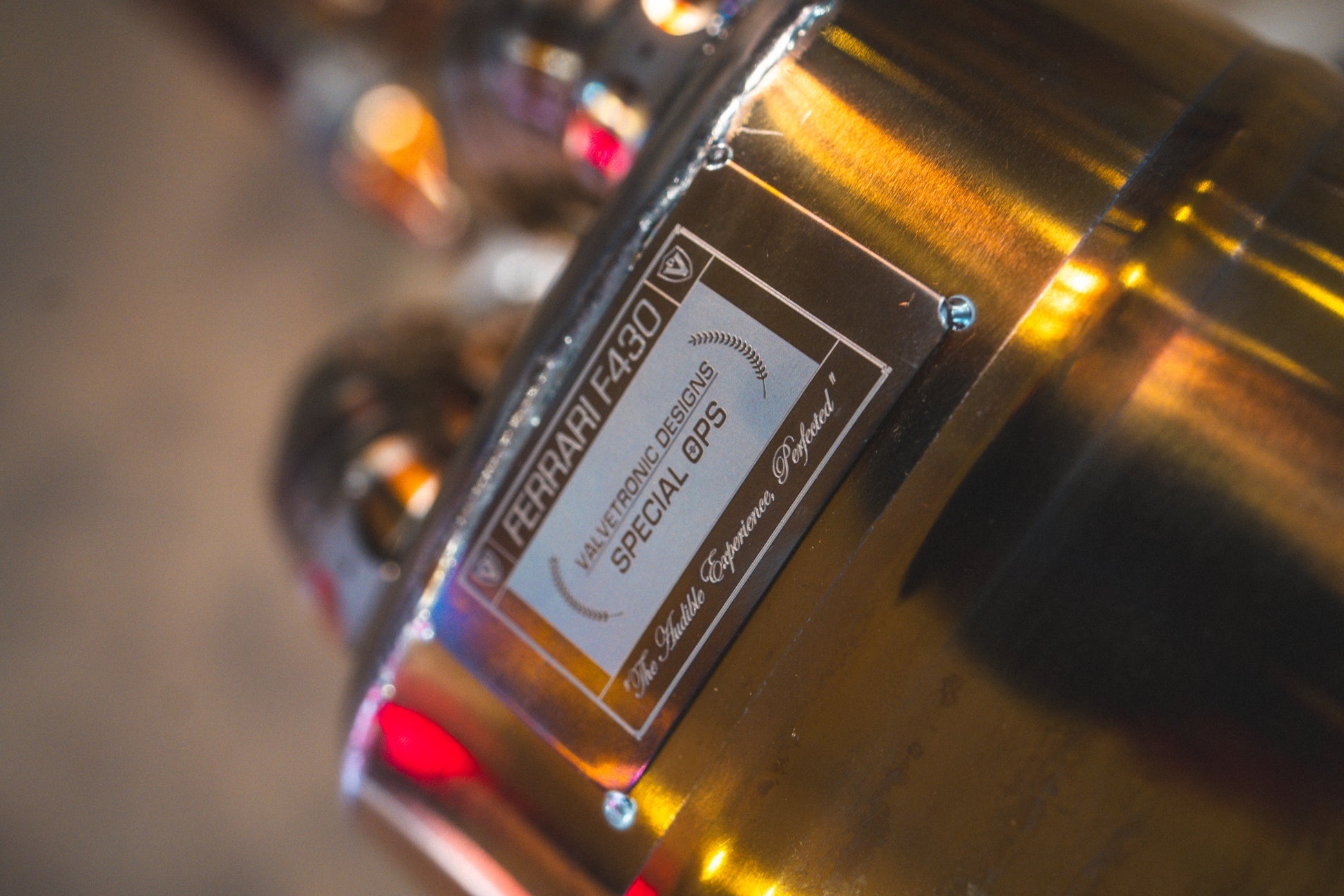 Welcome to a sound revelation for the Ferrari F430. These vehicles are well renowned for their incredible sound characteristics from the factory, but at Valvetronic Designs, factory exhaust systems just won't do. The factory exhaust system uses valves in the rear section, and with the valves opened the exhaust travels from the headers out of the exhaust tips with no crossover. The lack of crossover means the sound does not have that high-pitch flare we all love. With our exhaust system for the F430 we believe we have created the greatest-sounding road car on this planet. Comprised of T304 stainless steel our exhaust system features a top-mounted muffler in order to lower sound levels with the valves closed. This helps ensure your neighbors and others around you are not overburdened with sound when the time is not right. With the valves open the exhaust travels unrestricted through the knife-edged X pipe and out of the center exhaust tips. This configuration allows for the rawest, high-pitched sound experience available. Having been extremely fortunate to work on some of the world's greatest exotics, the F430 holds a very special place in our hearts because they remind us why the perfect sound solution can make a vehicle so special. The downpipes are in Inconel shielded to reduce engine bay temperatures and the rest of the exhaust system features our traditional Gold finish to do the same and turn this exhaust into a true piece of artwork. At Valvetronic Designs, we have engineered this exhaust to provide an unparalleled sound experience. We do not compromise and neither should you.